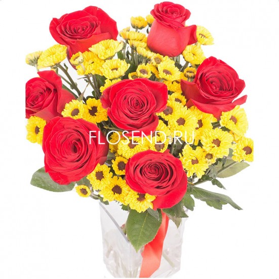 Букет «10 желтых хризантем и 7 красных роз»